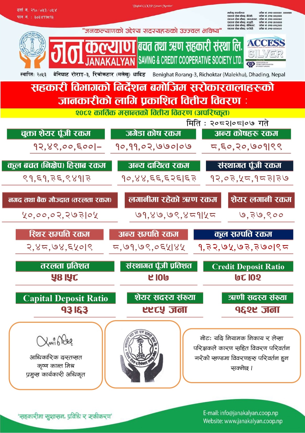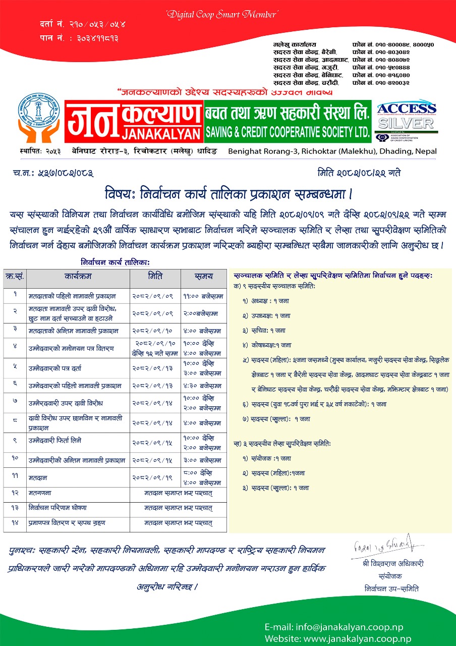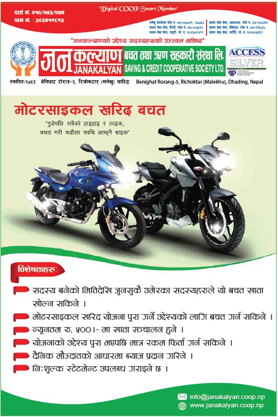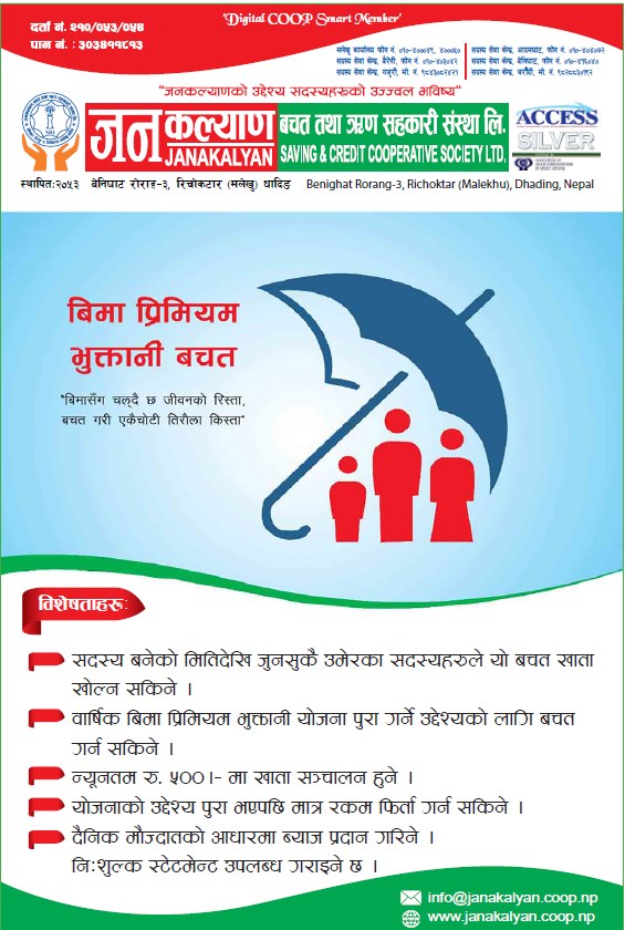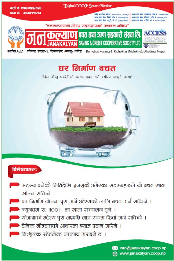 Slide OneSlide One New Announcement Loan Schemes PrintPrintagriculture_loaneducational_loanemergency_loanPrintPrint Saving Schemes SavingSavingSavingSavingmonthly_savingSavinglaptop_savinglaghu_bitta_savingkhutruke_savingeaichhik_savinggift_savingSavingAGM_77 Member Registration Form New Service Centers नयाँ बचतका दरहरू हेर्नुहोस् Market Representative Vacancy Assistant Teller Vacancy Senior Manager Form 28th Annual Report Book 2081 Financial Statement [Ashadh] Download App Institutional Profile Share Capital Saving & Deposits General Reserve Fund Loan & Investment Institutional Capital Fixed Assets Total Assets Members New Schemes ( Click to view ! ) Ask CEO: Name Email Address Message Number 7 + 8 = Submit खुल्ला रक्तदान कार्यक्रमका केही झलकहरु